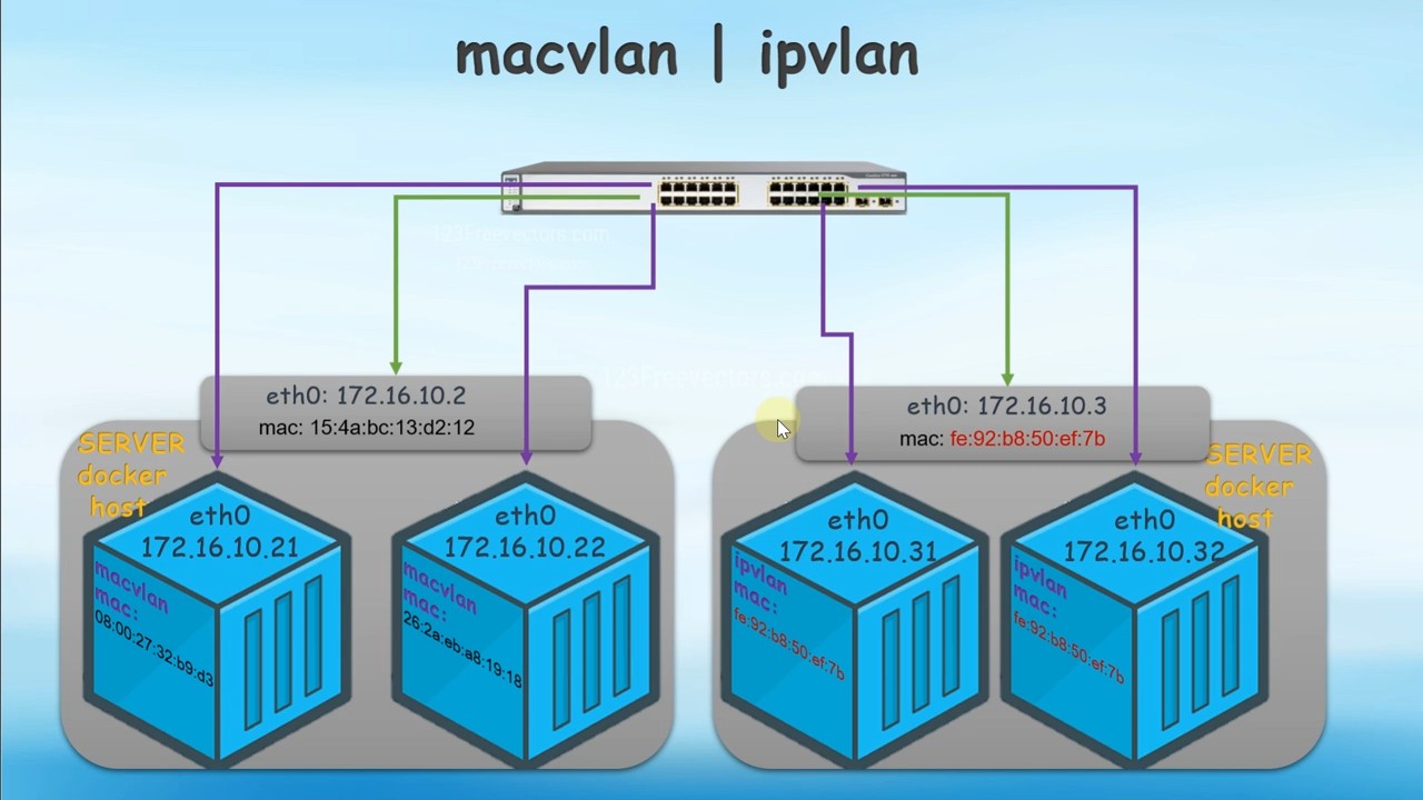 ipvlan – все контейнеры имеют одинаковый mac адрес, но разные ip