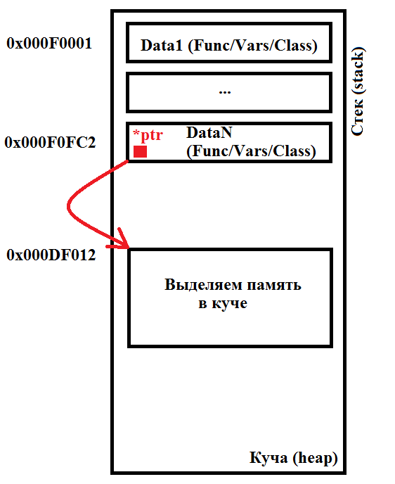 Схематично стек и куча обозначены на рисунке, из области памяти DataN указатель *ptr ведет в область кучи, где динамически выделена память.